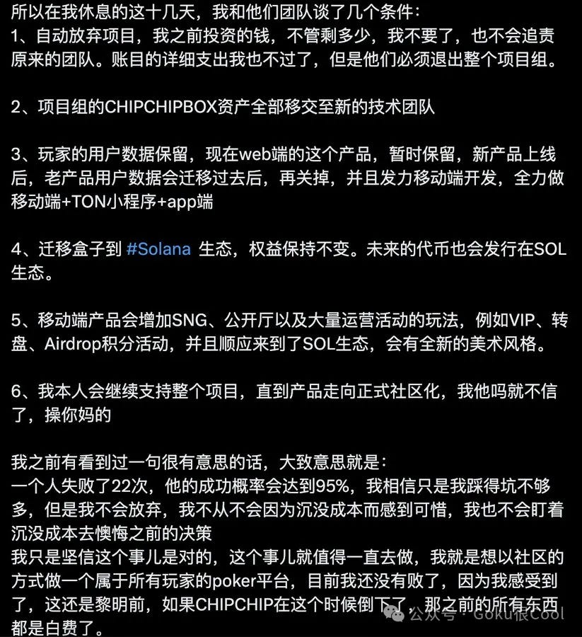 之前盒子持有者原本的策略是未来 CHIPCHIP 发币会给大家空投 10% 的代币,这部分会有锁仓,一点点解锁,设置锁仓条件原本是为了市值稳定,但是如果一个项目从零到一过程中,市值足够低,大家起步点足够一致的时候,PVP 带来的实际上是对项目的合理预期体现,如果一个垃圾表情包靠谁是谁的儿子、谁是谁的爹、谁曾经发了一个牛逼的 Meme 币,这种烂叙事和烂到你姥姥家的未来,不一波流想屁吃呢?