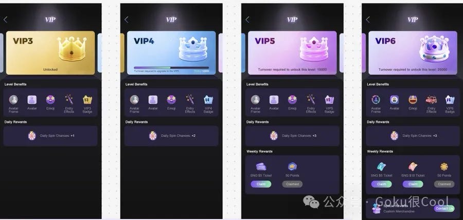 1、用户 VIP 体系,流水越高,获得的 VIP 等级越高,对应的权益越多,例如每日赠送的转盘次数、SNG 门票、豪华周边等等。