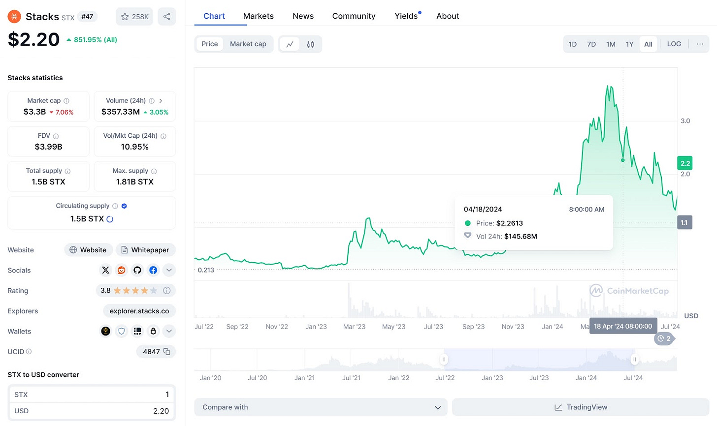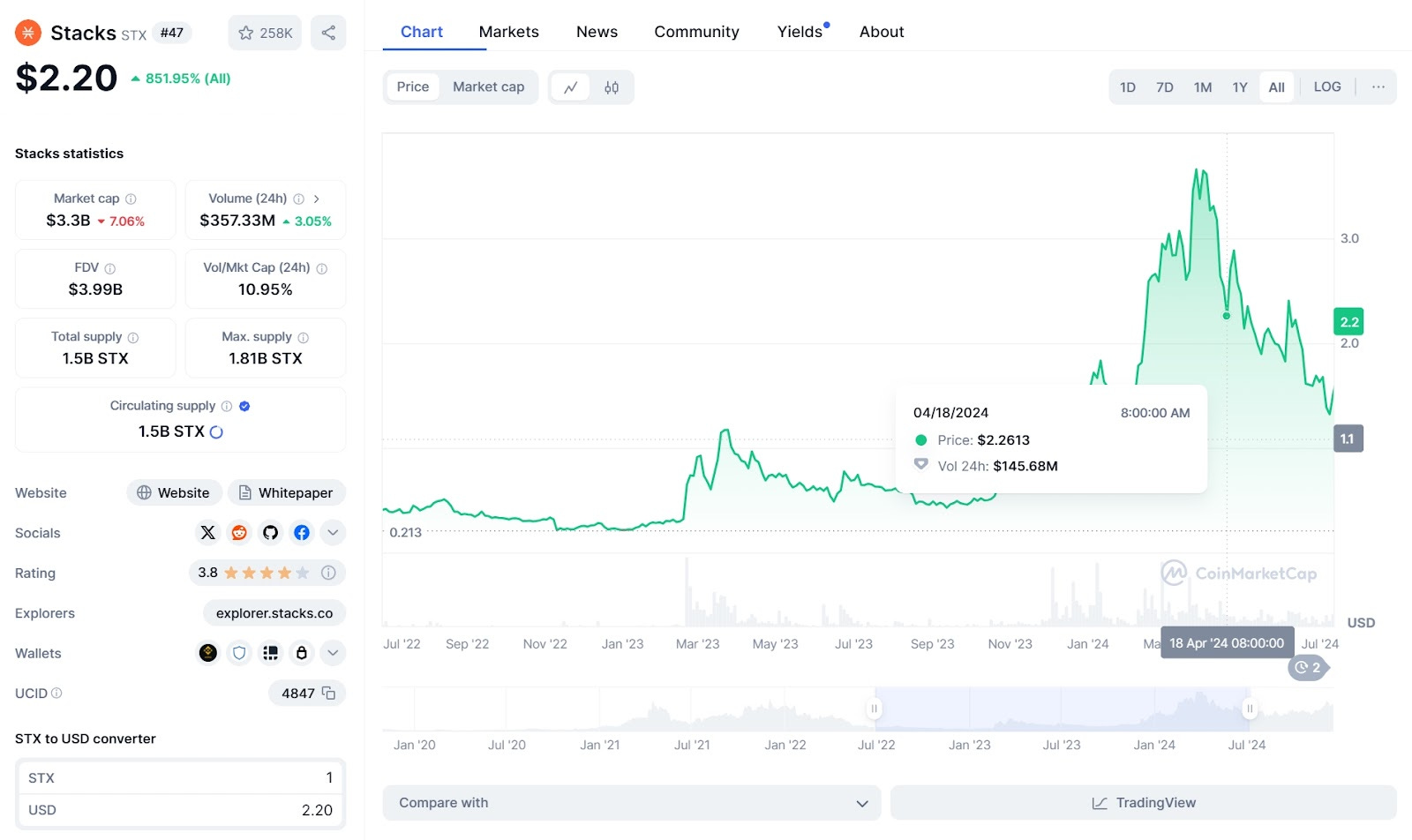 Stacks 也已经发行了自己的代币 STX ,现在市值 33 亿左右,今年 3 月份铭文爆火那会,作为一个比特币二层网络,Stacks 也是迎来了一波暴涨,不过随着铭文热潮的消退,价格也有所回落。