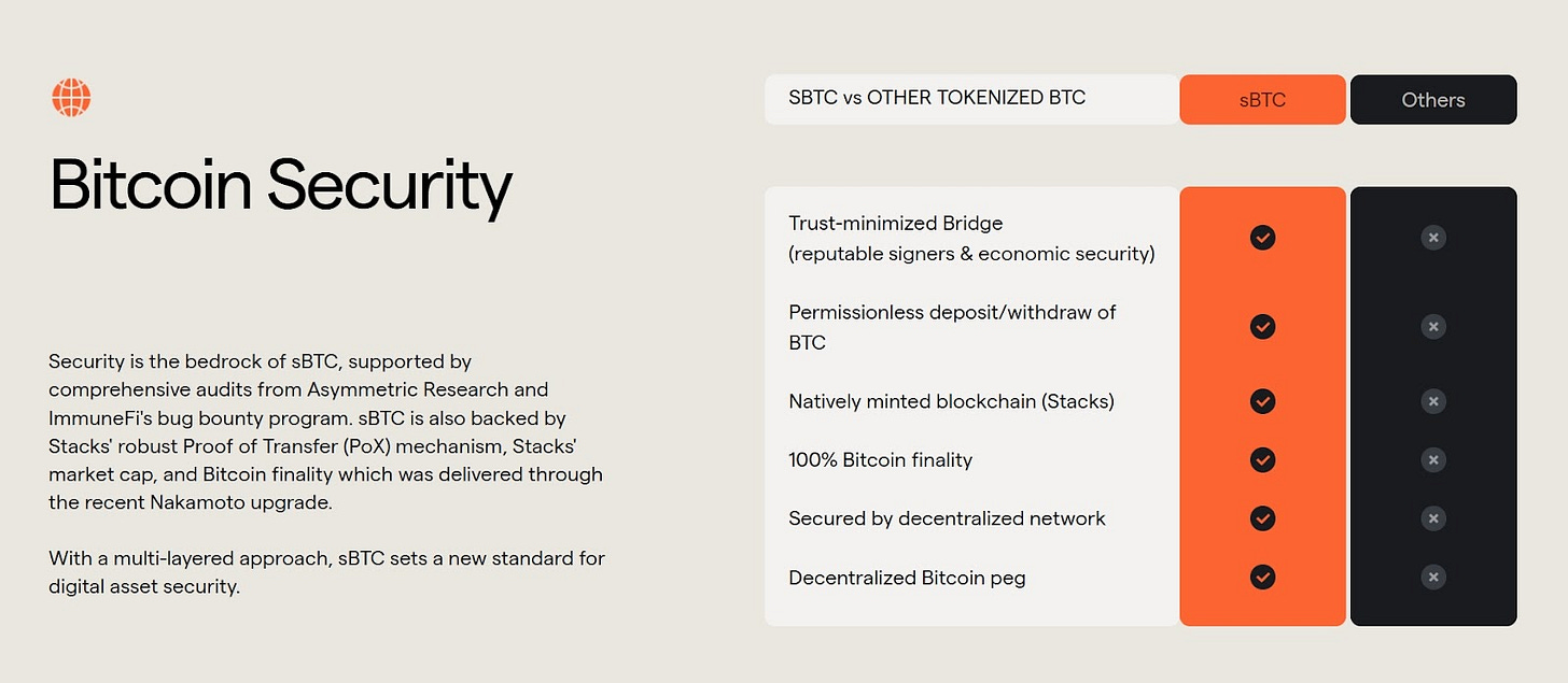 sBTC 在安全性方面的最大优势之一是它 100% 依赖比特币的最终确定性,也就是 sBTC 的安全性是由比特币网络来保障的,它拥有和比特币同等的安全性。sBTC 通过 Stacks 网络上的智能合约与比特币保持紧密联系,任何操作都需要比特币上的区块确认。