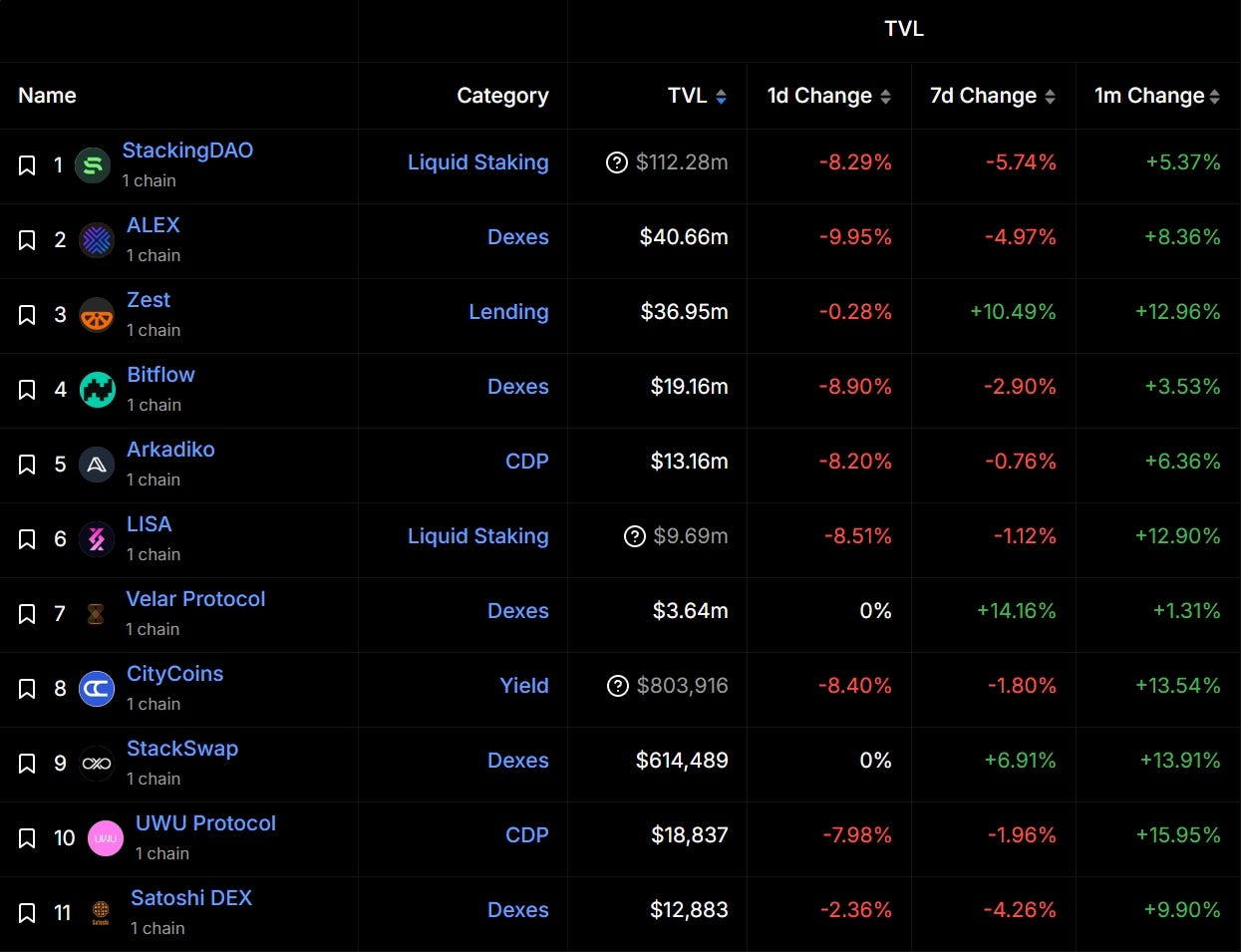除了基本的 5% 年化收益外,sBTC 还可以用于参与 Stacks 生态中的各种项目,比如流动性挖矿、借贷市场、稳定币质押等。现在 Stacks 生态上各种 DeFi 项目已经非常完备了,TVL 也有 1.1 亿美金。