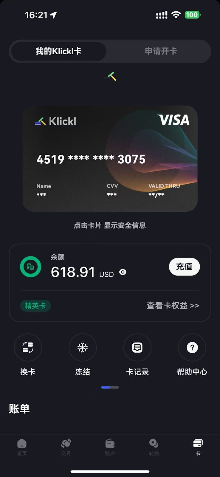 你还可以开一张信用卡,绑定到淘宝美团,平时买个东西点个外卖,都能直接用加密货币支付。Klickl 的卡可以绑定 AppStore ,这是最高等级的虚拟卡才有的,所以 Klickl 的卡是所有虚拟卡里面支付失败最低的。