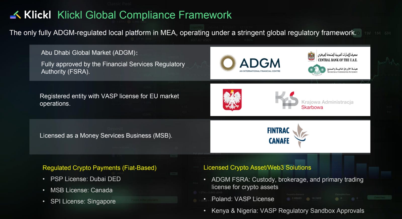 实际上,Klickl 很早就开始布局全球合规运营,刚建立的时候就获得了阿布扎比金融服务管理局(ADGM)的正式许可,Klickl 还是少数拥有新加坡金管局(MBS)支付牌照加密平台,除此之外,Klickl 还拥有欧盟、加拿大、澳大利亚、肯尼亚、尼日利亚等多个极具分量的合规经营牌照,可以说是同业合规牌照数量最多的平台之⼀。