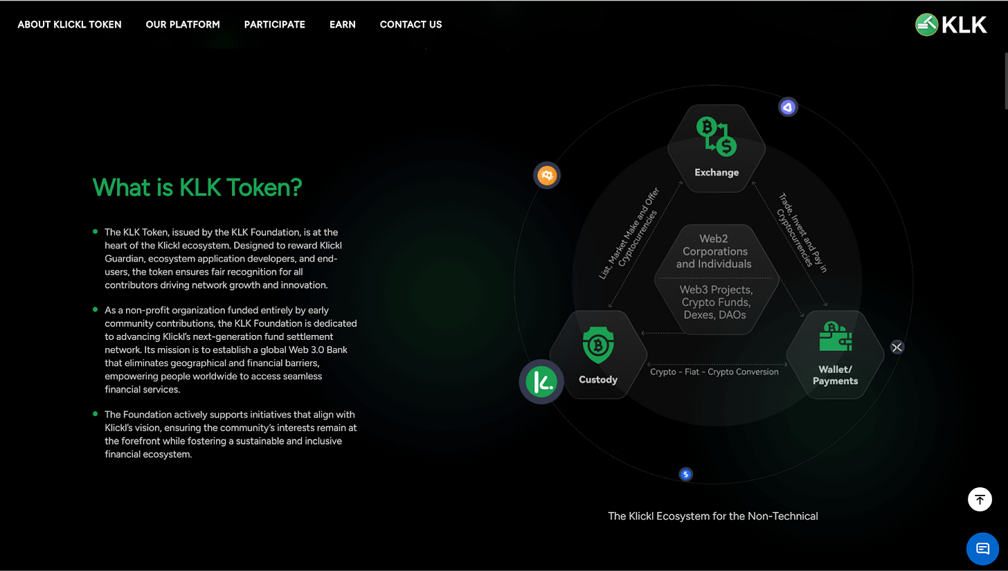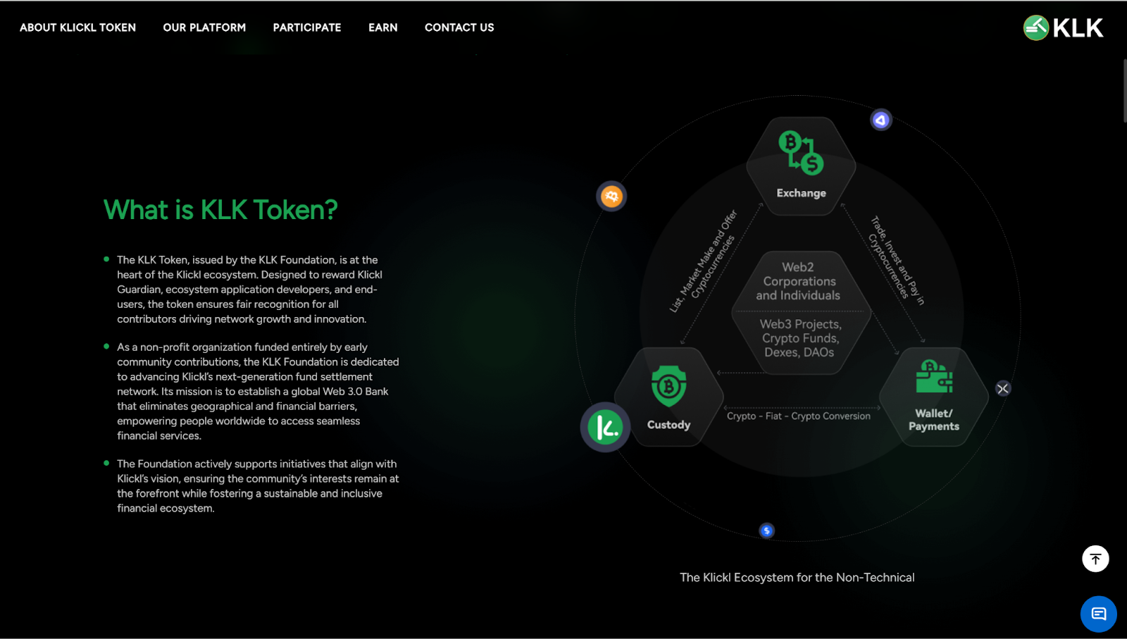 为了实现这个目标,由社区早期参与者捐款资助成立了一个非营利组织,也就是 KLK 基金会,并发行了 KLK 代币来推动 Klickl 这个资金清算网络的建设。