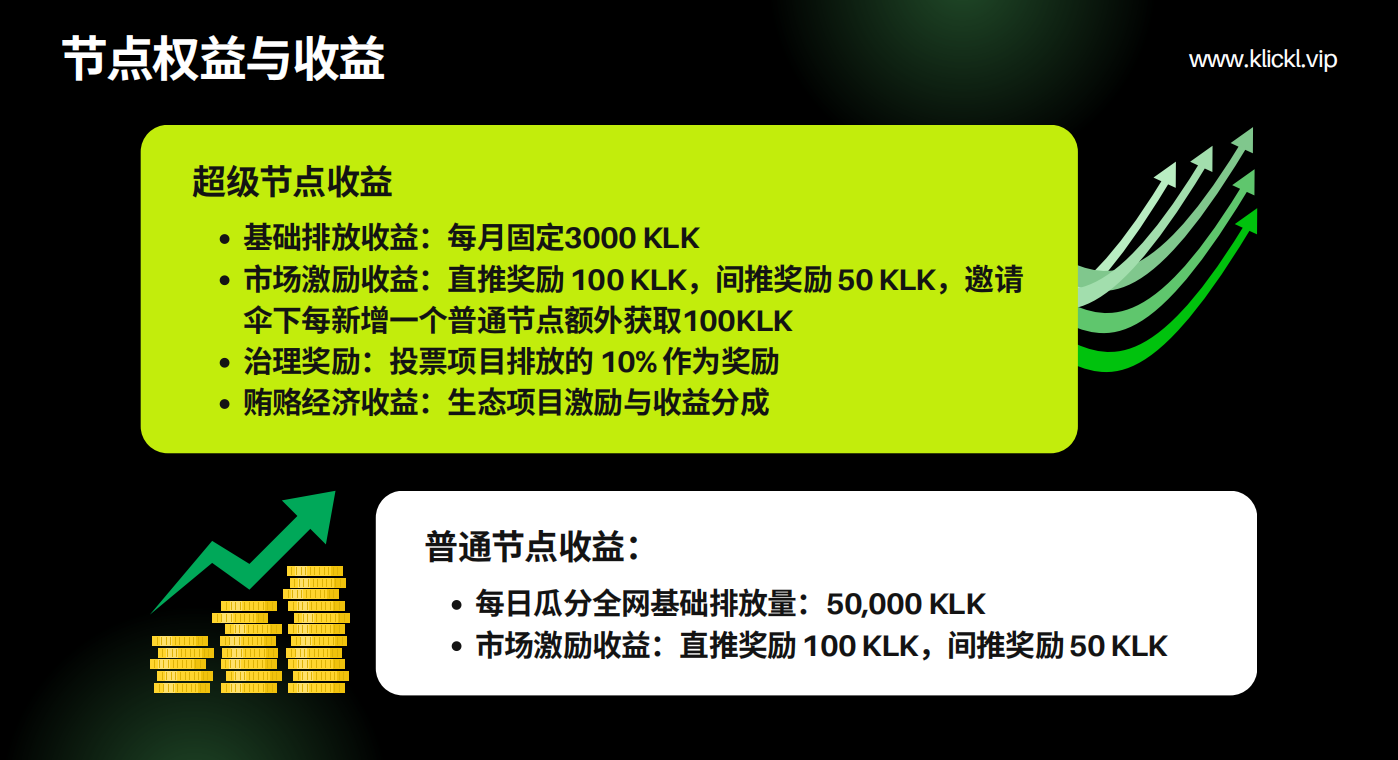 KLK 的经济模型中,有一部分是支付激励,叫 Pay to Earn,这是用来奖励网络中产生真实支付行为的用户,用户在使用过程中会获得积分奖励,而邀请这些用户的节点也同样有积分奖励,网络每天会跟着积分占比来分配这个奖励。